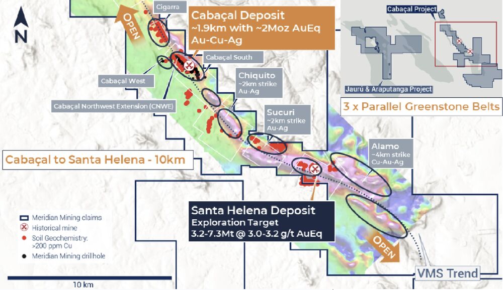 Wenn wir bei Meridian Minings (WKN: A3EUQY) ‚Cabaçal‘-Projekt berechtigterweise von einer Portfolio-Perle sprechen, sollten wir das Bild einer Perlenkette unbedingt vor Augen haben. Denn auf dieser reiht sich neben ‚Santa Helena‘ nun auch das gerade einmal 5 km südöstlich davon gelegene neue Ziel ‚Santa Fé‘ auf. Hier stieß Meridian nämlich auf eine offene 2.200 m lange Kupfer-Gold-Bodenanomalie.