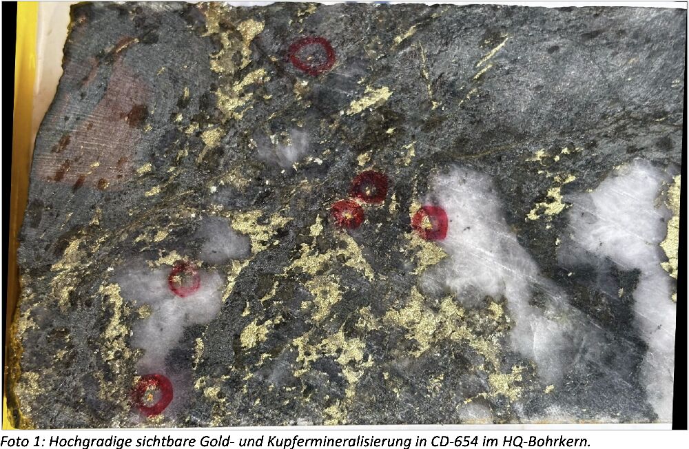 Neben den rekordträchtigen 276 g/t Au auf 0,46 m mit sichtbarem Gold, förderte CD-654 in dieser Zone nämlich auch phänomenale 14,8 g/t AuÄq (11,0 % CuÄq) über 9,9 m zutage, einschließlich satte 71,4 g/t AuÄq (53,1 % CuÄq) über 1,9 m.