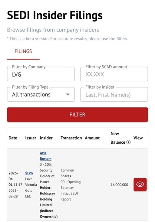 Abbildung 1: Der aktuelle Auszug aus der Insider-Plattform Sedi.ca zeigt, dass Rostam Aziz seit dem 1. April 2025 16 Mio. LVG-Aktien hält.