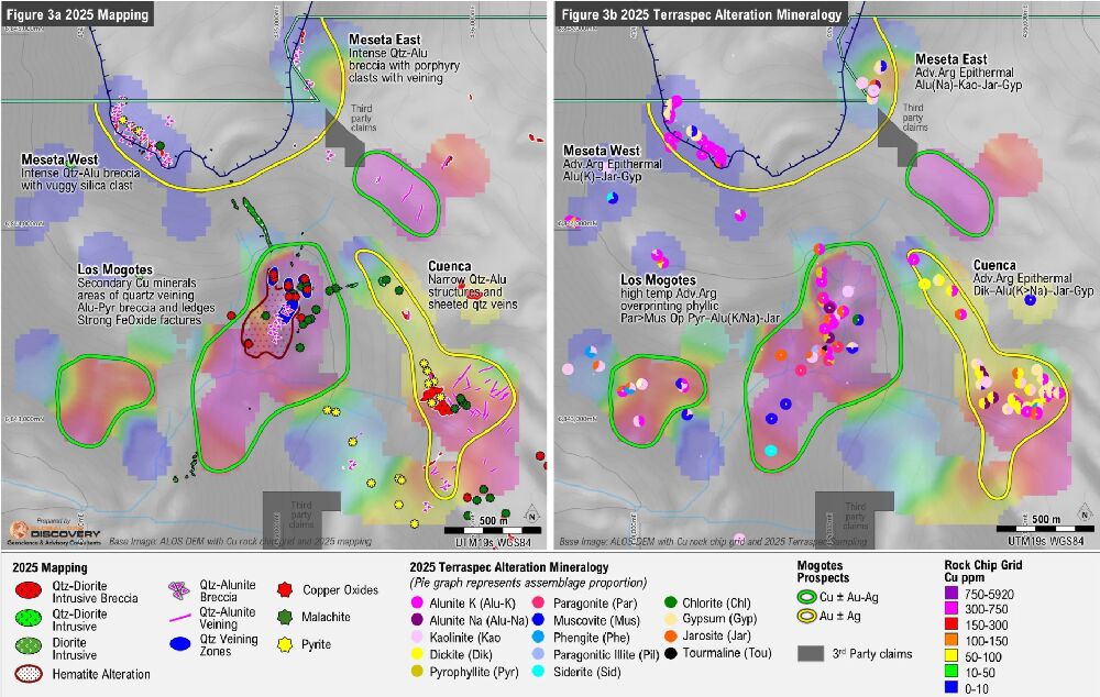 Fortgeschrittene tonhaltige Alterationen (Quarz-Alunit-Kaolinit) deuten auf ein oberflächennahes Hochsulfid-Epizentrum hin, während Porphyrklasten und Mo-Au-Cu-Anomalien erste Vektoren auf ein tieferliegendes Kupfer-Gold-Porphyr-System liefern. Besonders eindrucksvoll: Gesteinssplitter aus ‚Meseta East‘ lieferten bis zu 1,48 g/t Gold und 18,8 g/t Silber – ein klares Signal für ein verborgenes, hochgradiges System, das MT/IP-Vermessungen in den kommenden Wochen in die Tiefe loten werden.