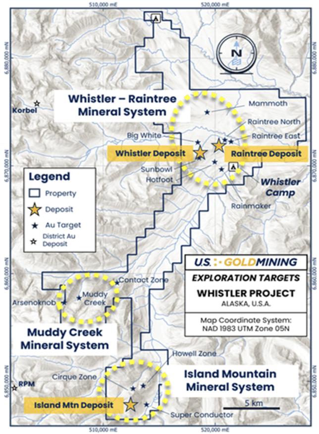 U.S. GoldMinings (WKN: A3D7H8) 100 % unternehmenseigenes Gold-Kupfer-Projekt ‚Whistler‘ in Alaska beherbergt kombinierte rund 6,5 Millionen Unzen Goldäquivalent in der Kategorie ‚Angezeigt‘ und fast 4,2 Millionen Unzen Goldäquivalent in der Kategorie ‚Abgeleitet‘, verteilt auf gleich drei hochgradige Gold-Kupfer-Porphyr Lagerstätten (‚Whistler‘, ‚Raintree West‘ und ‚Island Mountain‘).