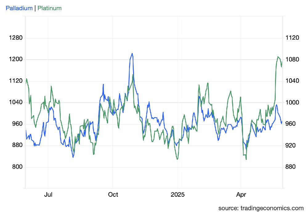Beide Power-P's weisen damit einen Preisabschlag von rund 2.000,- USD/Unze gegenüber Gold bzw. eine Preisratio von über 3:1 verglichen zum glänzenden Gelb hin. Mit Blick auf eine sich in absehbarer Zeit normalisierende Zollpolitik – und darauf weisen unter anderem ja die anhaltenden Gespräche zwischen den USA und der EU hin – könnte das rekordverdächtige Preisräume nach oben öffnen, sowohl für Platin wie auch für Palladium.