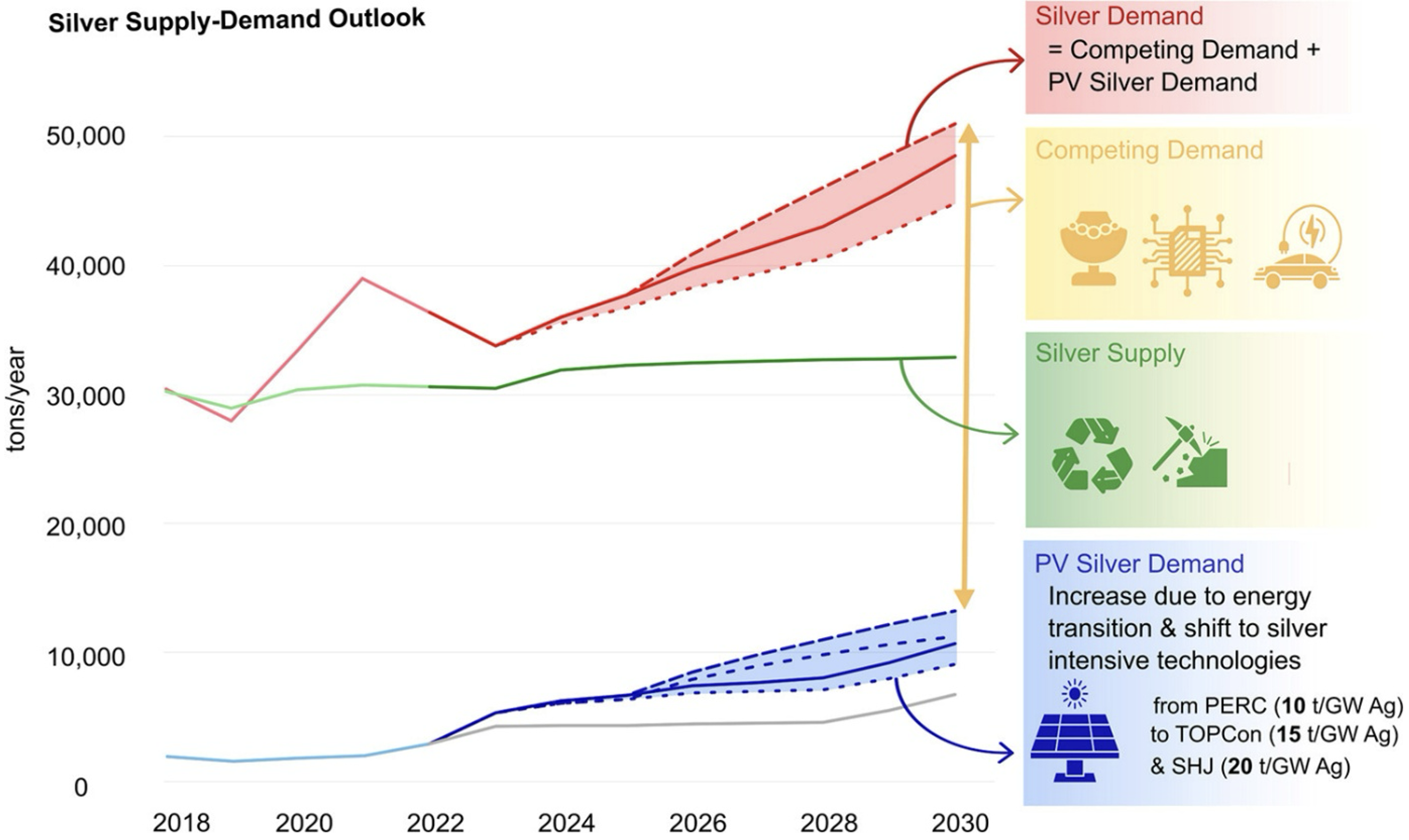 Anders die industrielle Nachfrage. Eine Studie kommt hier zu dem Ergebnis, dass bis zum Jahr 2030 bestehende Silberangebot nur 62–70 % der Nachfrage seitens E-Autos, Rechenzentren und vor allem der Solarindustrie decken wird.