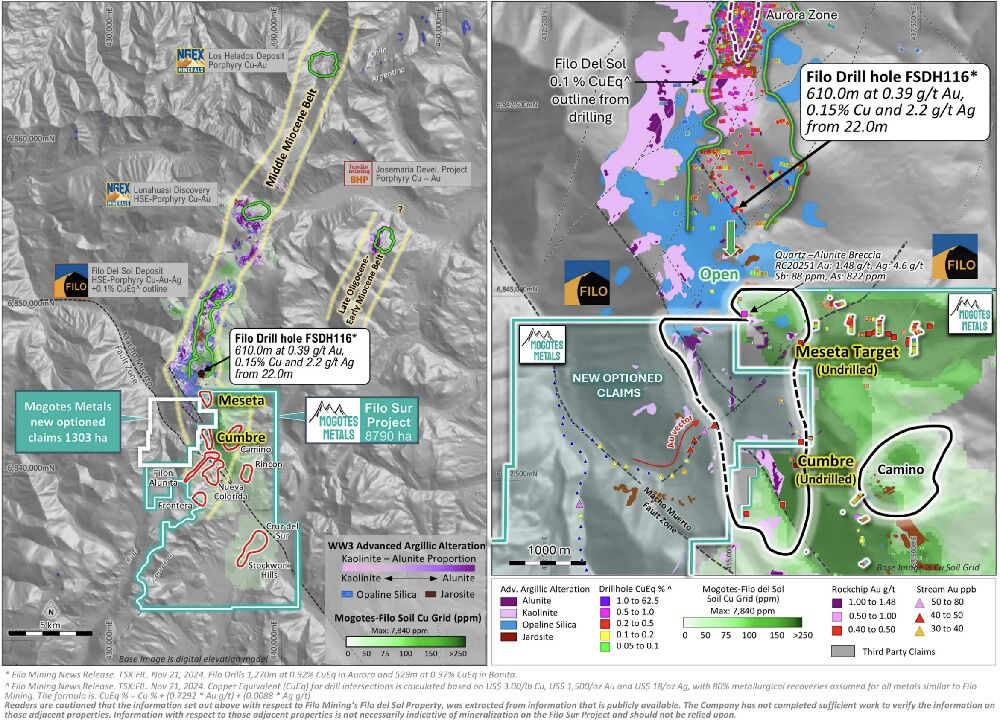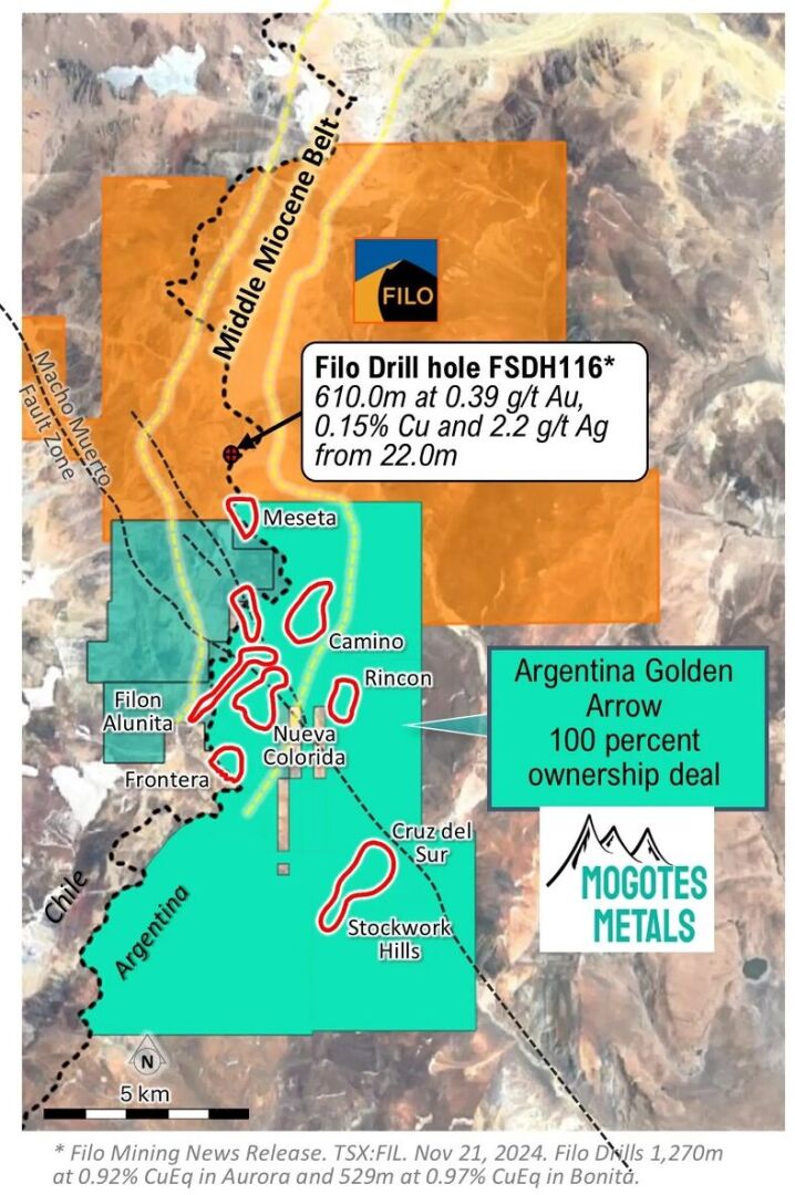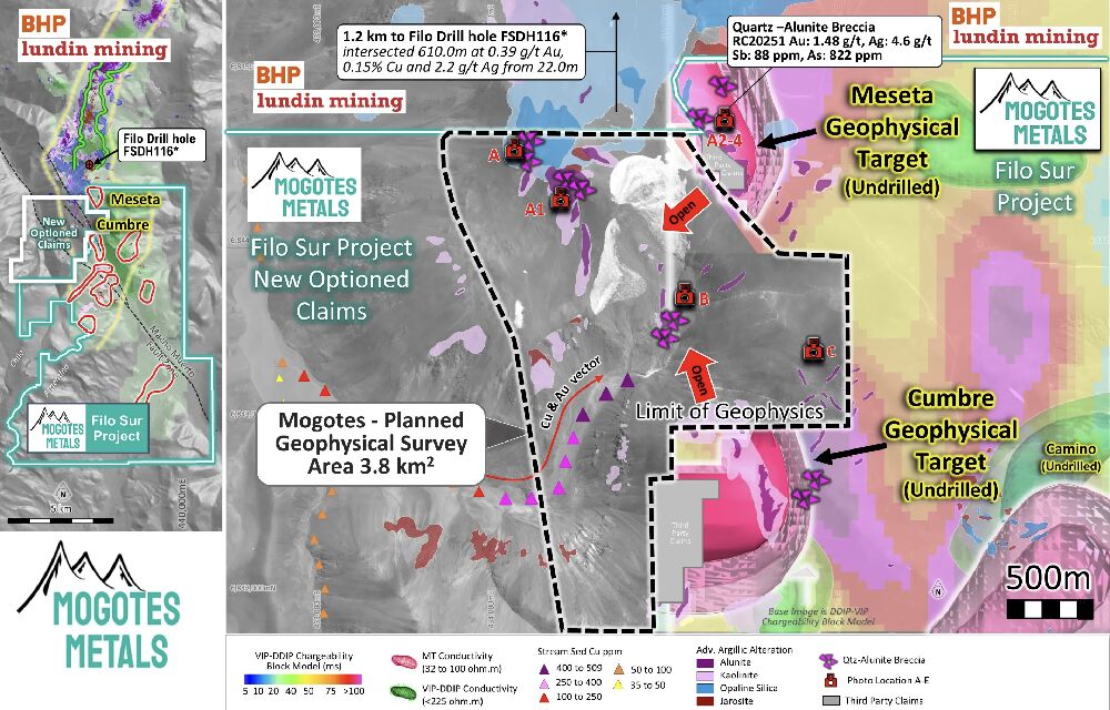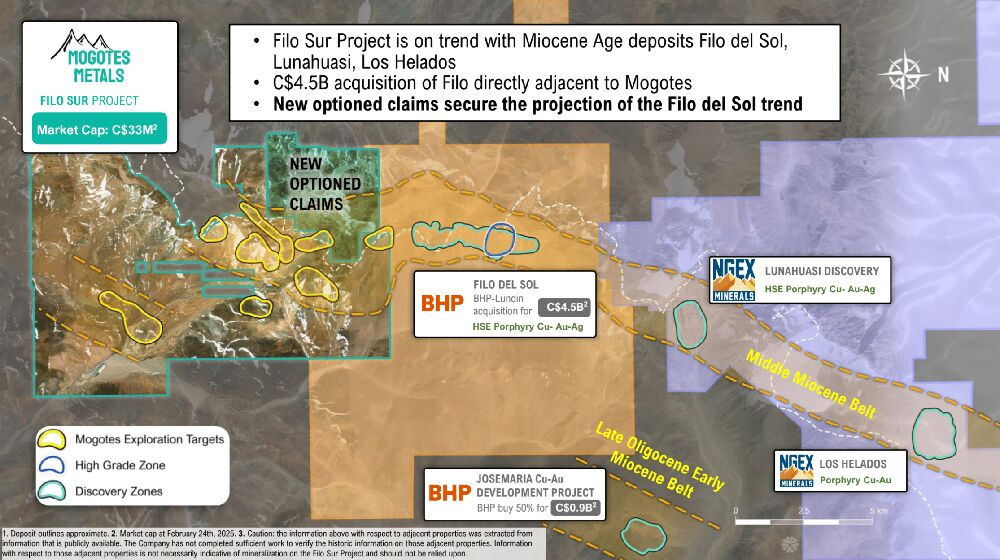 Das ‚Filo Sur‘-Projekt liegt unmittelbar südlich des renommierten ‚Filo del Sol‘-Projekts von Filo Mining und erstreckt sich entlang des vielversprechenden ‚Vicuña‘-Metallogengürtels, der für seine reichen Kupfer-, Gold- und Silbervorkommen bekannt ist. Diese Region hat in den letzten Jahren bedeutende Entdeckungen hervorgebracht, darunter die Lagerstätten ‚Lunahuasi‘ und ‚Los Helados‘ von NGEx Minerals. Durch die vollständige Kontrolle über das ‚Filo Sur‘-Projekt stärkt Mogotes seine Position in diesem erstklassigen Explorationskorridor erheblich.