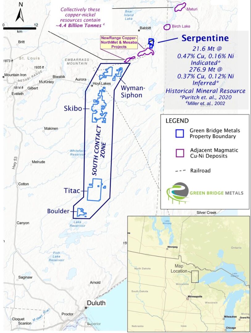 Superlativ ist auch die Lage von ‚Serpentine‘ inmitten des mega-gehaltvollen ‚Duluth‘-Komplex im Norden von Minnesota und zudem in unmittelbarer Nachbarschaft zu Green Bridge Metals (WKN: A3EW4S) Mega-Asset ‚South Contact‘-Zone.