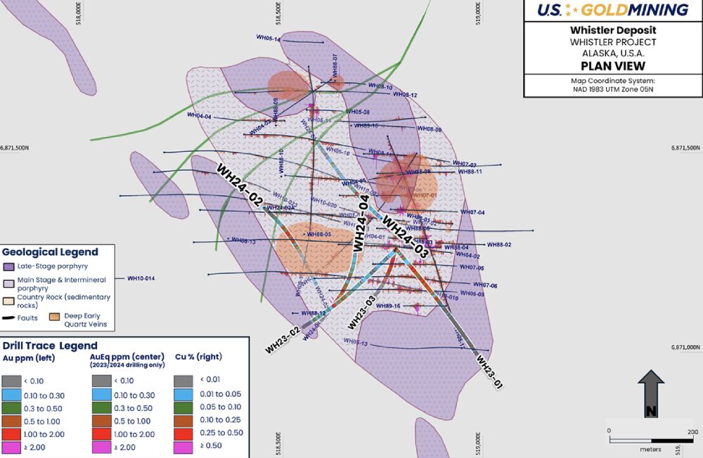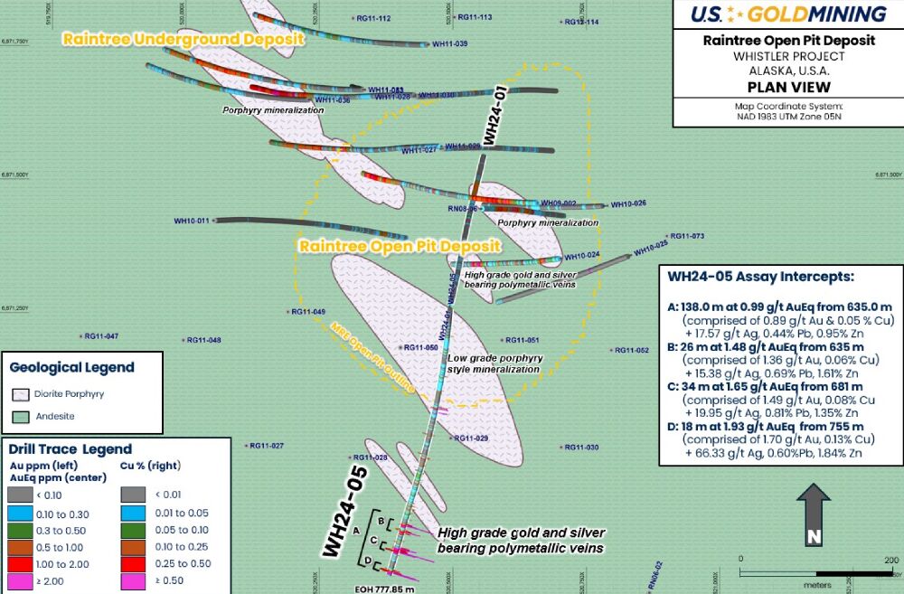 Kaum einen Monat später meldete U.S. GoldMining (WKN: A3D7H8) weitere beeindruckende Bohrergebnisse, diesmal unweit der Lagerstätte ‚Raintree West‘. Dort nämlich förderte Bohrloch WH24-05 rund 500 m südlich der bisher bekannten Mineralisierung, unter anderem großartige 0,99 g/t AuÄq über 138,0 m zutage.