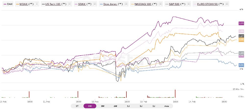 Donald Trump ließ es sich nicht nehmen, kurz vor dem morgigen Feiertag (Washington's Birthday) noch einmal die Märkte aufzuwirbeln. Mit einer Twitter-Attacke drohte er erneut mit Reziprozitätszöllen gegen Handelspartner, die amerikanische Produkte besteuern. Zwar fehlt ein konkretes Datum für die Umsetzung, doch die Märkte interpretierten diese Rhetorik eher als Verhandlungsstrategie als unmittelbare Gefahr. Der inflationäre Druck durch einen überraschend hohen Verbraucherpreisindex sorgte zunächst für Nervosität, doch die Renditen der Anleihen entspannten sich bis Donnerstag deutlich und ließen Raum für Erholung.