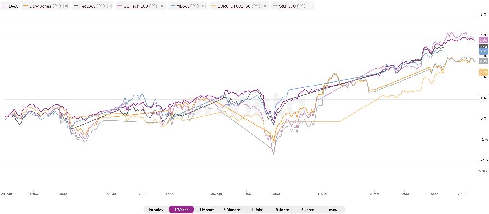 Am Donnerstag ruhte der Handel in Deutschland aufgrund des Feiertags zum „Tag der Arbeit“ (1. Mai). Die verkürzte Handelswoche konnte der positiven Grundstimmung an den Märkten jedoch nichts anhaben.