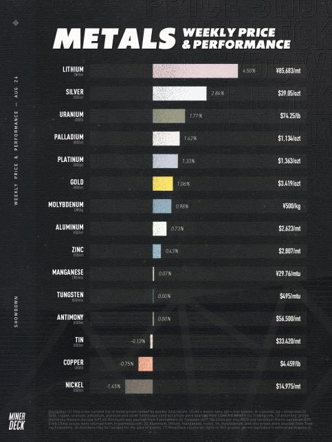 Im Edelmetallsegment tat sich dagegen wenig. Gold notierte die gesamte Woche über stabil bei etwa 3.400,- USD je Unze – auch hier dominierte Zurückhaltung vor Jackson Hole.