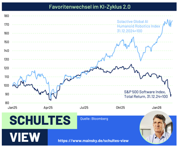 Das große Zukunftsthema im KI-Zyklus 2.0 sollte aber „Physical AI“ werden. Damit sind Systeme gemeint, die nicht nur Daten verarbeiten, sondern ihre physische Umgebung wahrnehmen und Aufgaben erledigen, wie z.B. humanoide Roboter. So liegt der Solactive AI Humanoid Robotics Index in diesem Jahr mit 20 % im Plus und bildet damit den Gegenpol zu den Software-Verlierern.