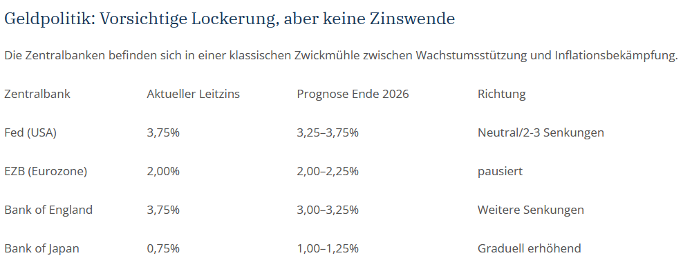 Das Jahr 2026 bietet ein konstruktives, aber nicht risikoloses Makroumfeld. Wir befinden uns in einem „Goldilocks“-Setup: Wachstum über dem Trend, Inflation auf dem Rückzug und Zentralbanken mehrheitlich in einer Pause oder mit moderaten Lockerungsschritten. Die Marktbreite nimmt zu, das KI-Thema verbreitet sich global, und fiskalische Impulse in Deutschland sowie den USA wirken stützend.
