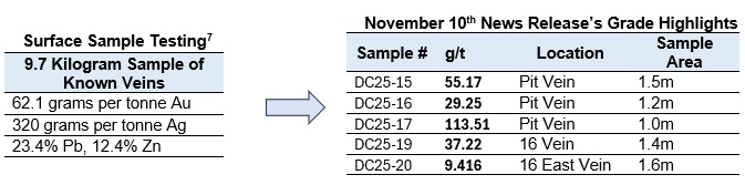 As conjectured, November 10th testing confirmed the original Surface Sample Testing; however, the emergence of new veins, such as the 16 East Vein, the widening of both the Pit and 16 Vein, and the discovery that all are open at depth and length.
