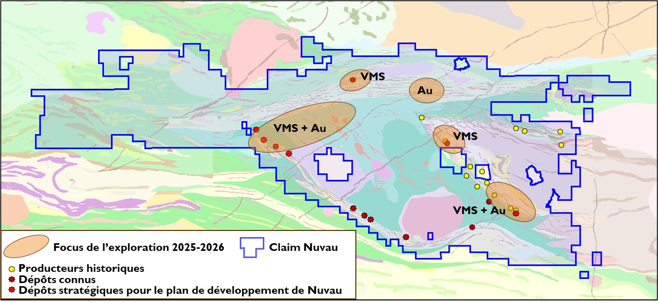 Figure 1 : Zones d'exploration prioritaires de Nuvau pour 2026 en matière d'or et de métaux de base (sulfures massifs volcanogènes)