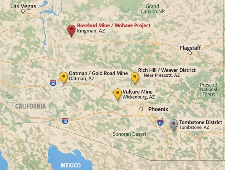Hier ist ein Überblick über legendäre Gold- und Silberminen bzw. historische Bergbaugebiete in Arizona und wie weit sie ungefähr vom Mohave-Projekt bzw. der historischen Rosebud-Mine bei Kingman (Arizona-Nordwesten) entfernt sind (Entfernungen grob nach Straßenkilometern / Fahrzeit):
