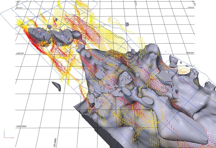 Die Auswertung durch Fathom Geophysics LLC (Ohio) lieferte ein vollständiges dreidimensionales magnetisches Inversionsbild des Projekts. Das 3D-MVI-Modell identifizierte einen kohärenten Satz NW-streichender magnetischer Features, die eng mit den kartierten Aderstrukturen und dem Fußabdruck der historischen Rosebud-Grubenbauten übereinstimmen.