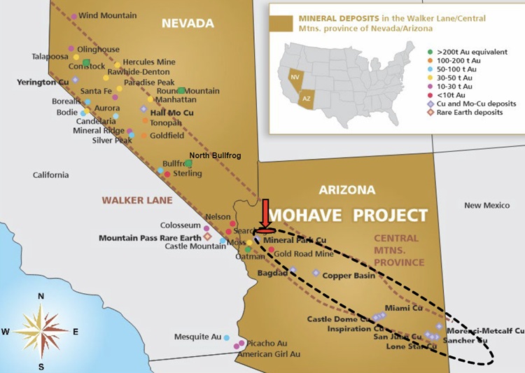 Der regionalen Geologie nach liegt das Mohave-Projekt am Südostende des Walker Lane Gold Trends in Nevada, wo dieser in den Laramide Arc Kupferporphyry Belt von Arizona übergeht. Das benachbarte Mineral Park Porphyry-System liegt nur rund 37 Kilometer entfernt – und Geologen haben darauf hingewiesen, dass Rosebud und Music Mountain möglicherweise die oberen Ausläufer eines tieferen, porphyrischen Systems darstellen könnten. Ein solches Potenzial, wenn auch geologisch noch spekulativ, gibt dem Projekt eine Dimension, die weit über ein konventionelles epithermal-aderiges Vorkommen hinausgehen würde.