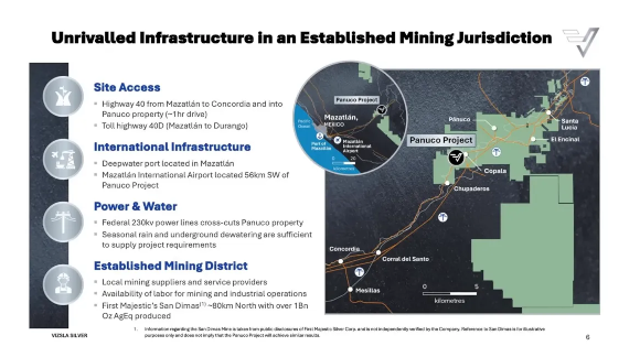 Das Projekt liegt in Sinaloa, knapp eine Stunde von Mazatlán entfernt — eine Region mit fertiger Infrastruktur: Fernstraßen, Tiefwasserhafen, internationaler Flughafen und Stromleitung, die direkt über dem Mill-Standort verläuft. Diese Nähe zu Versorgungswegen und einem erfahrenen lokalen Arbeitsmarkt reduziert Bau- und Betriebsrisiken erheblich und beschleunigt die Umsetzungsfähigkeit.